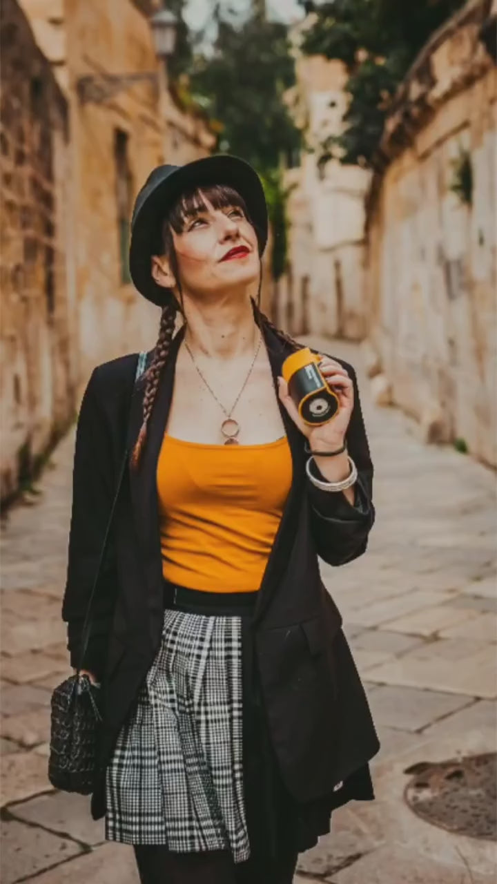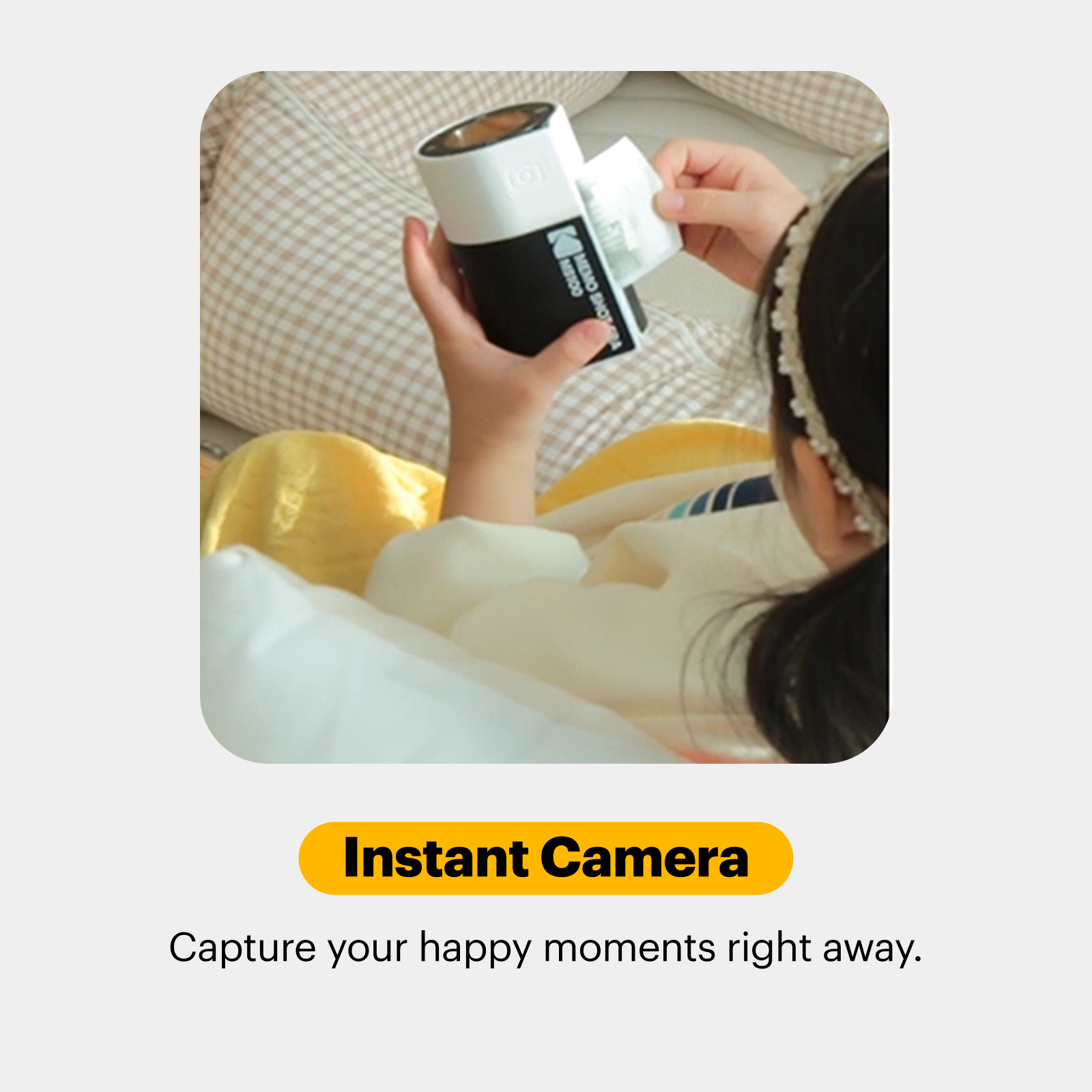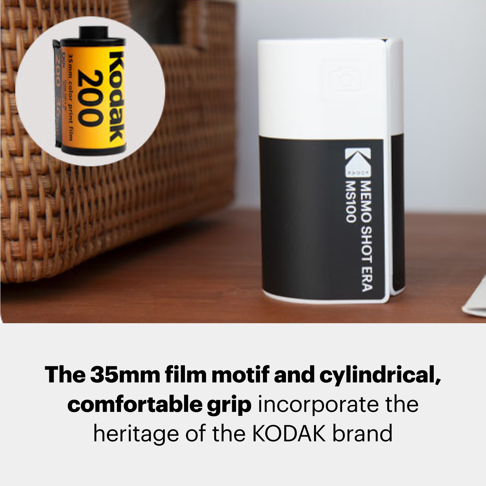 A label-printing camera inspired by Kodak’s iconic film canister design. Take photos and print them instantly, or connect your phone to print gallery images onto 2.7”x1.8” label paper via the KODAK MEMO app.