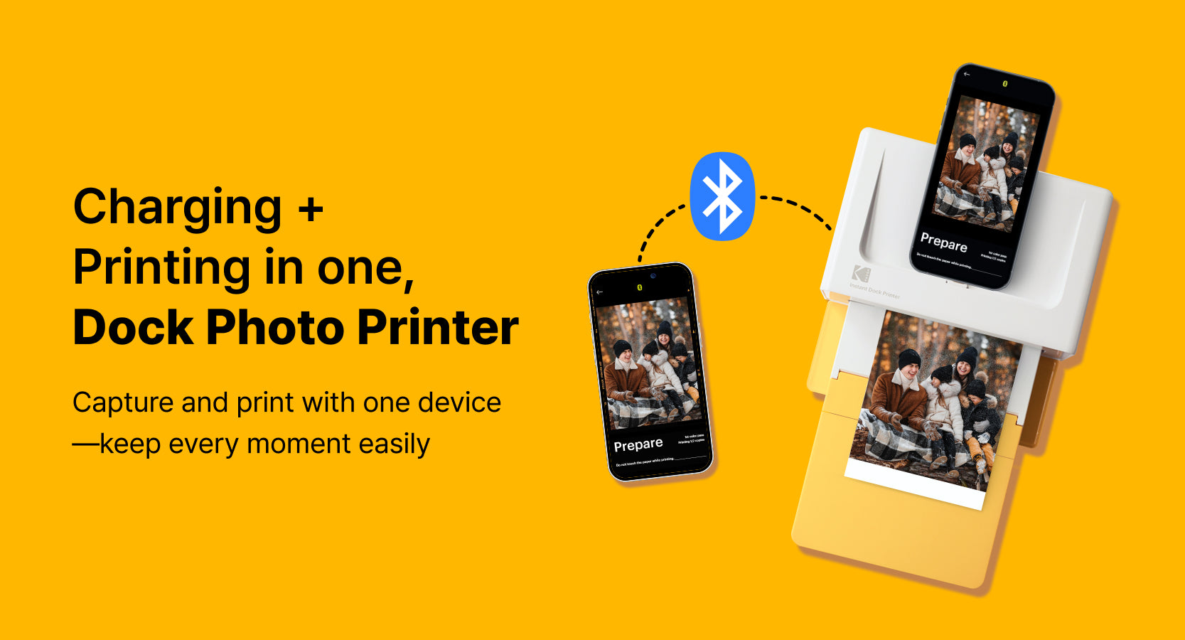 A desktop photo printer for 4”x6” postcard-sized photos. Connect via Bluetooth or simply dock your smartphone to print instantly.