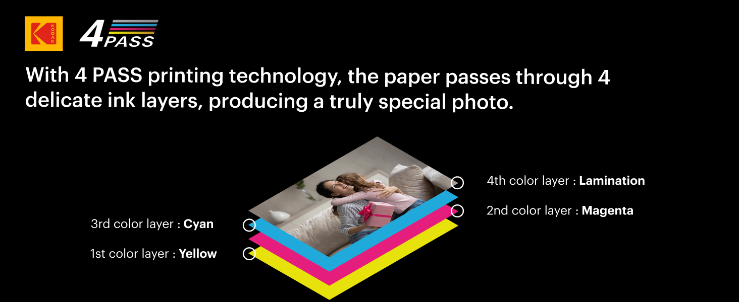 KODAK 4PASS uses dye-sublimation printing to deliver rich, high-resolution photos in four detailed layers.
