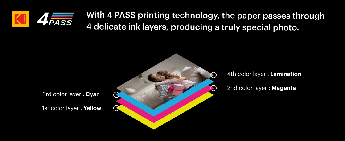 KODAK 4PASS uses dye-sublimation printing to deliver rich, high-resolution photos in four detailed layers.